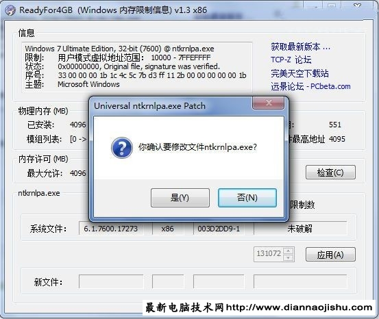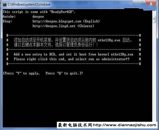 现在很多人都喜欢使用笔记本电脑,主要与笔记本电脑的方便便携有很大的关系。但是,我们也知道,笔记本电脑的容量是有限度的,这个就出现了扩大容量的问题。把老笔记本扩充到了4G内存,但是因为系统是32位的,导致不能完美的使用4G内存。安装了很多软件,又不想重新安装64位的Win7系统。所以只能想一个破解的办法。 好在早就有解决方案了: 1、下载ReadyFor 4GB破解补丁 in7 4G内存补丁(ReadyFor4G)下载,破解win7系统4G内存限制,ReadyFor4GB是国人编写的傻瓜化破解Win7内存4GB限制工具,让32位系统能用上4G或者更大的内存。应该说是识别,但是内存还是不能很好的用尽,4G以上内存,推荐还是用64位系统。 2、使用ReadyFor 4GB 解压后先运行ReadyFor4GB.exe 点击"应用"按钮,软件会进行破解和备份。 图片附件: untitled.png (2013-12-31 11:15, 233.19 K) 3、破解成功后,再运行 AddBootMenu.bat ,弹出命令行后,输入"y"然后回车。注意,要以管理员身份来运行这个批处理文件,否则不能执行成功。 图片附件: untitled2.png (2013-12-31 11:12, 140.16 K) 4、重启系统。 5、重启后,桌面会出现水印,下载"windows 7 去除水印工具"下的"Windows 7 Watermark Remover 32bit",输入"y"然后回车重启即可去除水印了!. 6、可是现在启动系统有2个,你可以用系统自带的或者用优化大师来修改默认启动项和启动时间,你也可以删除掉旧的![ 本文章最后由 cyb 于 2013-12-31 11:15 编辑 ]